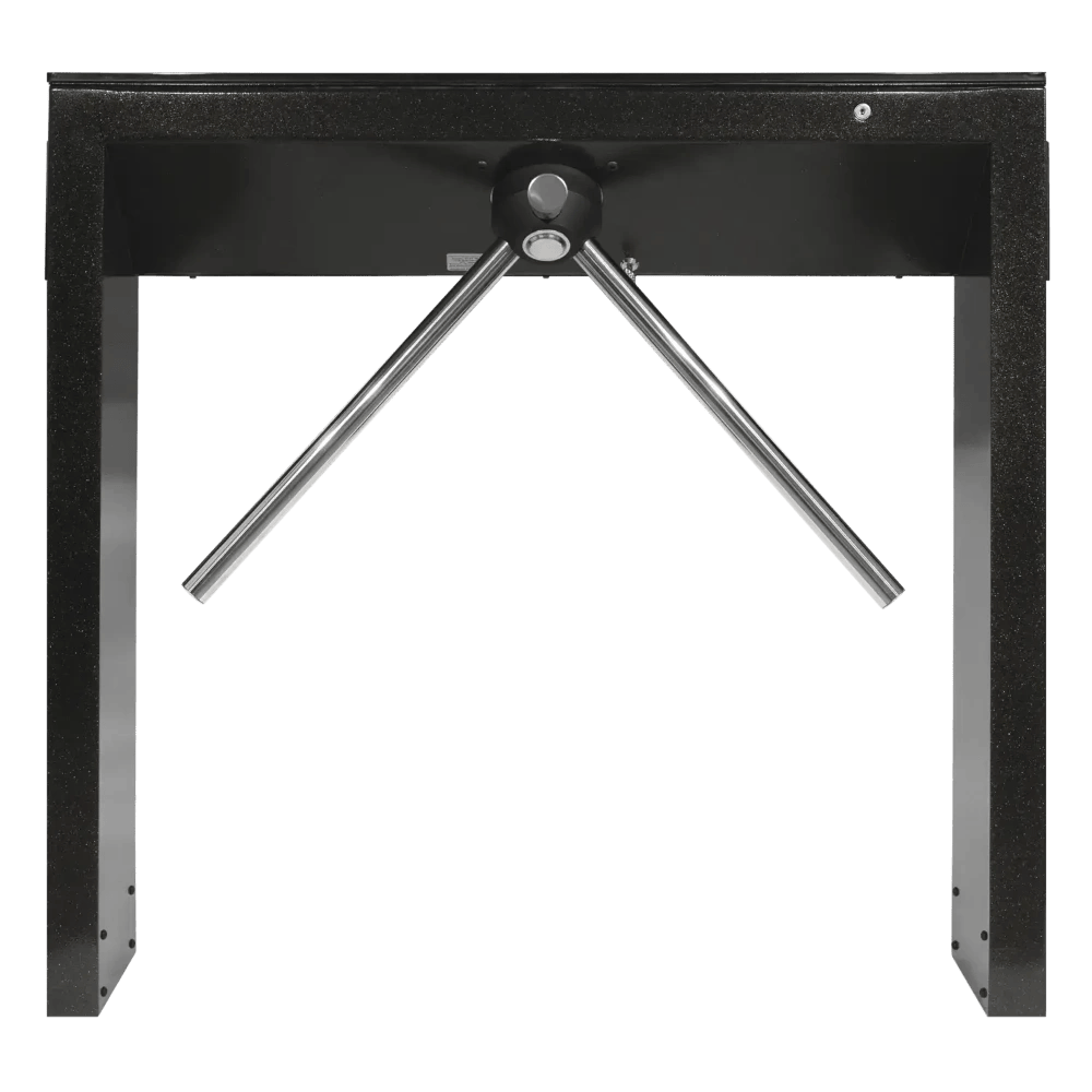 Стоечный электромеханический турникет-трипод 3V Model T в тёмном полимерном покрытии с крышкой из затемнённого калёного стекла, в которую встроено световое табло с индикацией прохода и с вместительной нишей внутри турникета. Для данной модели, в качестве завершающего элемента проходной из тумбовых триподов 3V, в линейку был введен тумбовый формирователь прохода 3V Model FT.